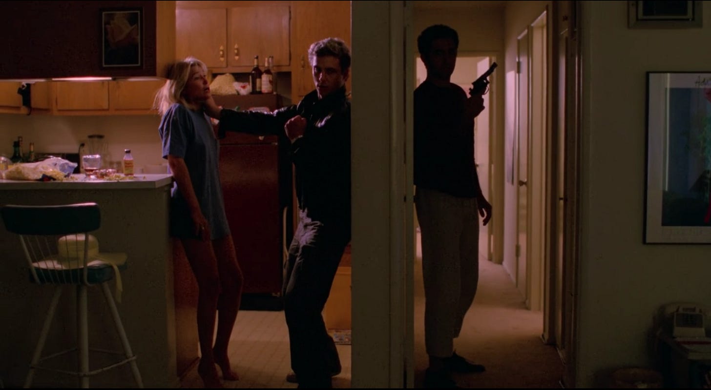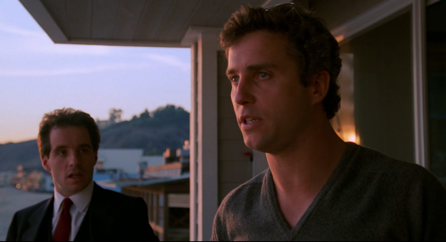 While looking and often sounding terrific, To Live and Die In L.A. is chock full of stuff that is stupid. A point is made that it’s hard to tell the good guys from the bad guys these days, and in a movie, we can accept good guys who are slow, to an extent. Bad guys can’t stumble around, and in a movie where every character is a different shade of bad, that’s not good. The baloney begins immediately with a wholly unnecessary prologue which no cop in the U.S. has ever encountered on the job, the stuff of a sloppy comic book. Chance’s retirement-age partner mutters, “I’m gettin’ too old for this shit.” Both camps are terrible at their jobs. It’s unclear how Masters alerts the Secret Service to his operation and whereabouts, why someone with a fine arts background deals with that problem by shotgunning a T-man to death, then goes about his business. Chance–a thinly sketched hot dog gunning for revenge, who despite a fine William Petersen performance, is boring–falls asleep on a stakeout, gets dry gulched by and loses a state prisoner in his custody, then sets out to rob a jewel smuggler without checking out who it is he’s robbing. This level of incompetence wouldn’t be believable with Room Service, much less the Secret Service. The heralded car chase, choreographed by stunt coordinator Buddy Joe Hooker (the ultimate name for a stuntman) is a video game, with gunmen popping up magically on overpasses as if pixelated. Sega, not MTV, seems to have been the evil influence here, making anything the film has to say about corruption impossible to take seriously.