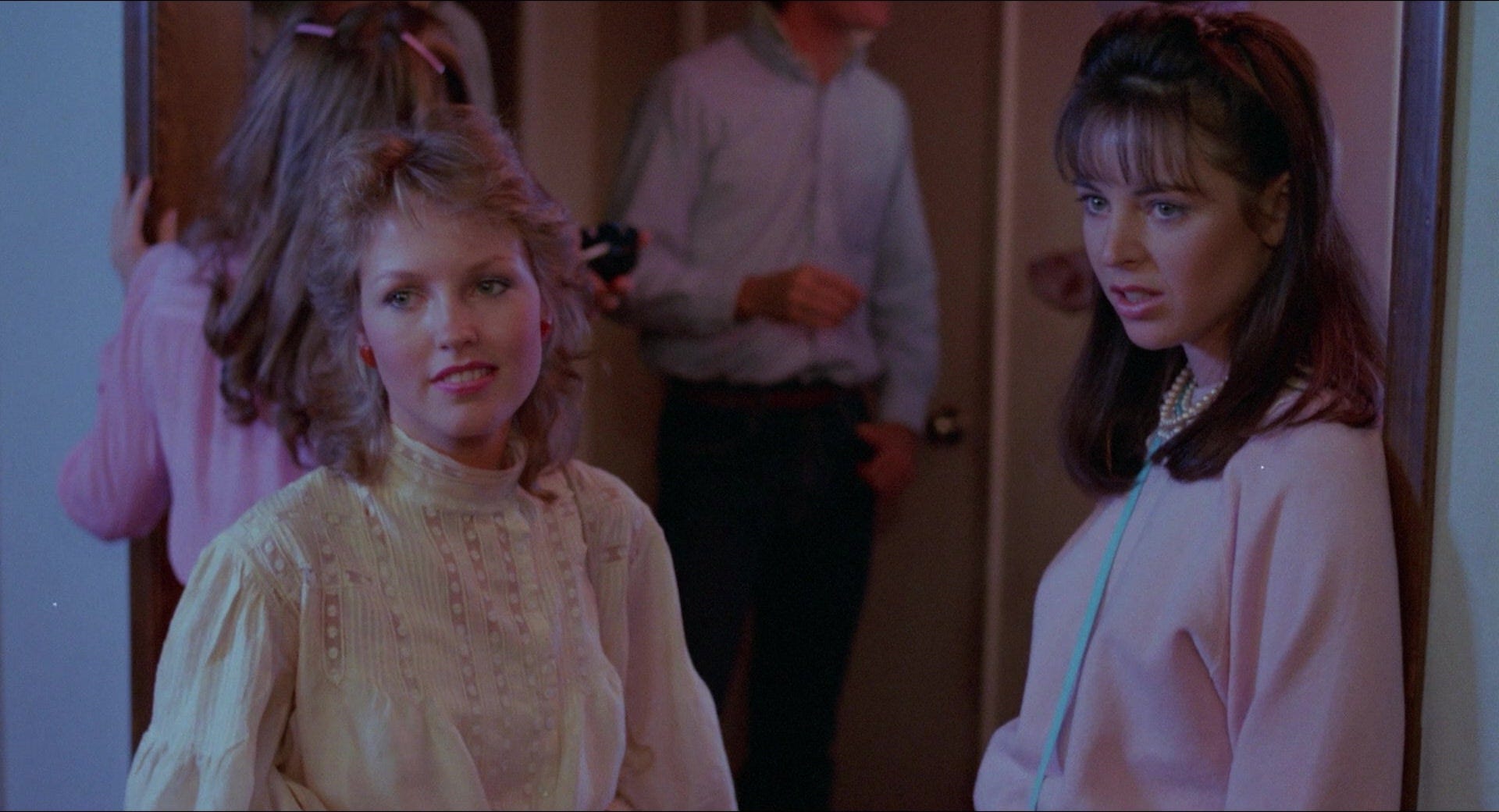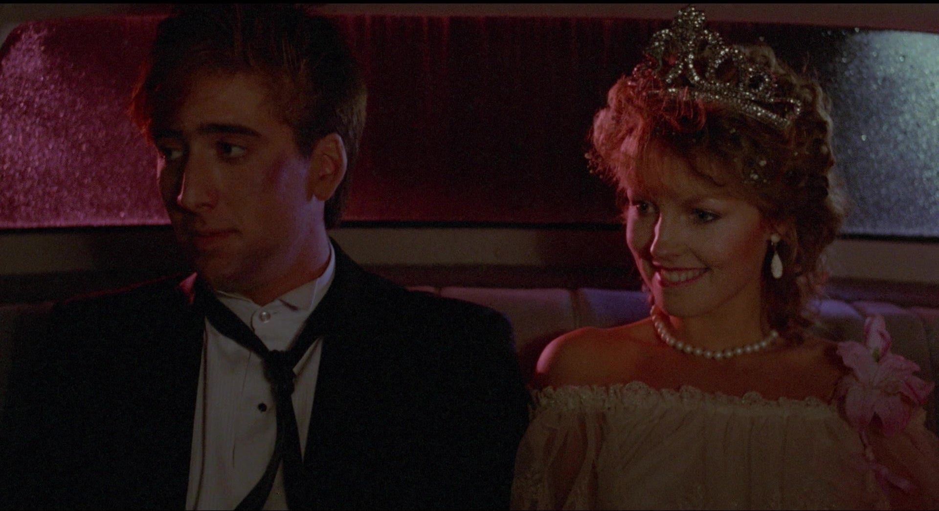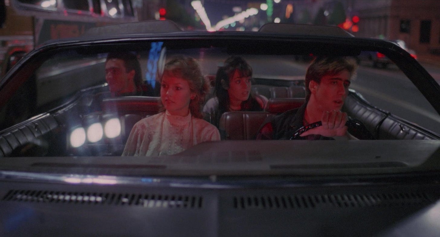 Valley Girl runs 99 minutes and its biggest flaw is a subplot doled out over three scenes featuring Lee Purcell character’s interest in a doofy teenage bicycle delivery boy that her daughter (Michelle Meyrink) has a crush on. It feels ordered by the studio, the obligatory horny teenager sex scene deemed necessary for an exploitation movie. What’s interesting is that even if the producers felt their movie required teenagers getting naked–for realism–their subplot isn’t boring, and among horny teenager movies, it’s an anomaly, focusing not on a dad’s infatuation with the babysitter, but on a housewife who feels more drawn to her daughter’s peers and is tempted to do something about it. The subplot sets up a reference to The Graduate (1967) which is called back to in the final shot, in which instead of fleeing her wedding, Julie flees her prom, not in the back of a bus but in the back seat of a limo, Nicolas Cage and Deborah Foreman wearing the same look of disillusionment (or maybe it’s exhaustion) that Dustin Hoffman and Katharine Ross share in The Graduate. It’s not a subtle reference, and how it ended up in an exploitation movie rushed into production–before Frank Zappa had a chance to make a “Valley Girl” movie his way–is one of the era’s most unexpected delights in film.
